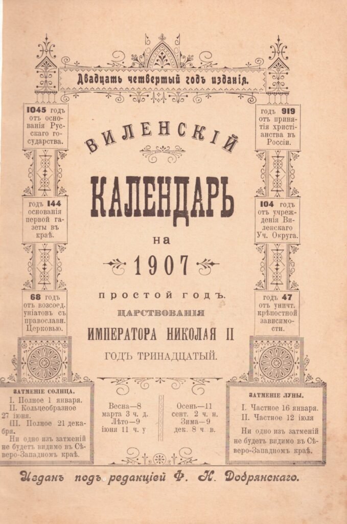 Виленскiй Календарь на 1907 простой год царствования Императора Николая II (год тринадцатый). Изданъ подъ редакцей Ф. К. Добрянского. – Вильна, Типографiя Русскiй Починь, 1904, VIII, 135, 124, [4] iliustr. Viršelio vidinėje pusėje – Vilniaus knygrišio Aleksandrovičiaus etiketė.