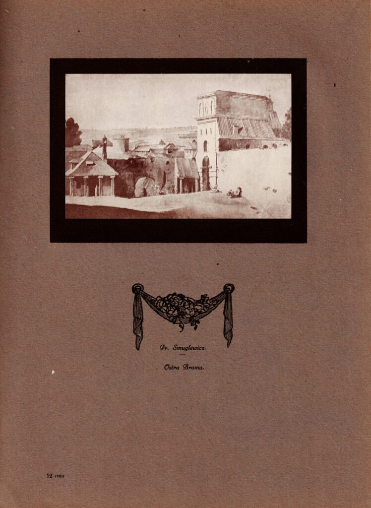 Zdobil książkę Ferdynand Ruszczyc. Wilno, Nakladem księgarni Józefa Zawadzkiego, klišes gamino Stanisławo Fleury cinkografijos dirbtuvė, 1912, [2], 17, [1], [23]; 27 cm. Numeruotas bibliofilinis leidinys. Tiražas 500 egz. Pranciškaus Smuglevičiaus Vilniaus vaizdų akvarelių reprodukcijos, istoriniai vaizdų aprašymai ir puošnus išlankstomas senovinio Vilniaus planas „WILNO w koncu wieku XVIII-go“. Cinkografija, 35,5 × 27.