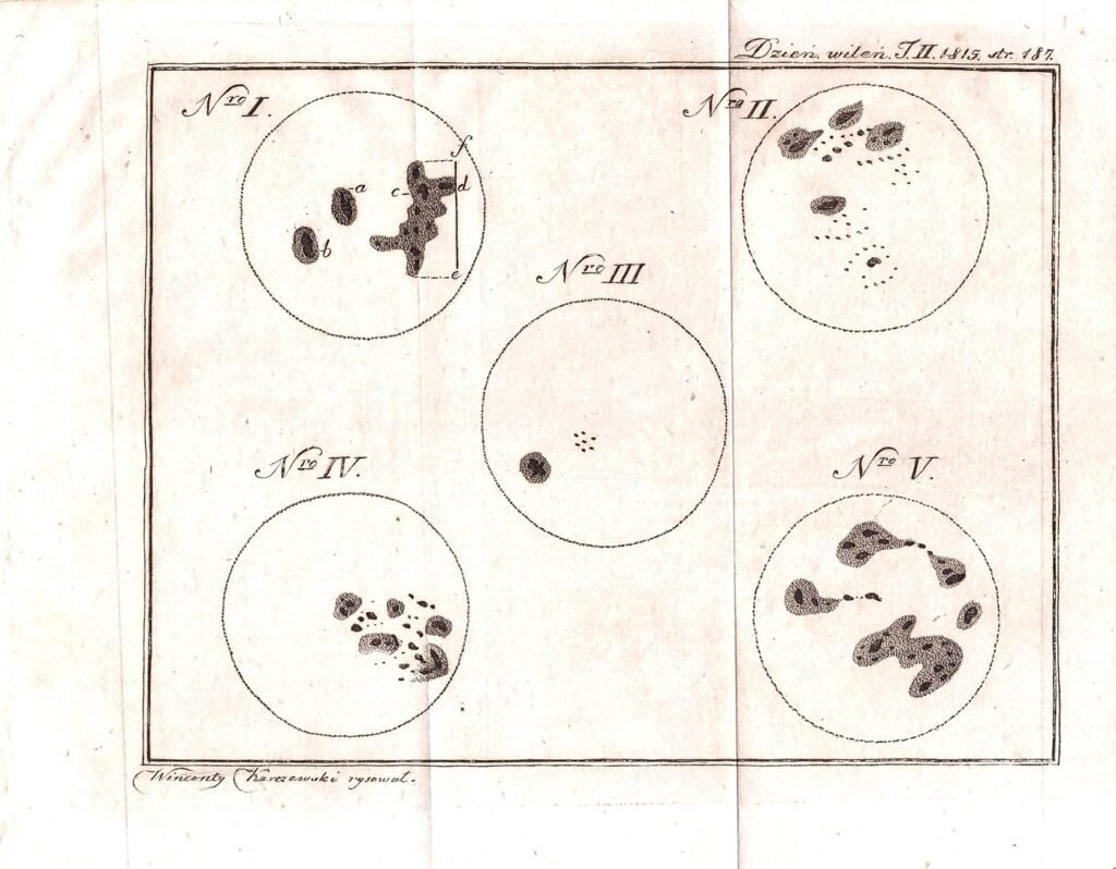 Saulės dėmės, pagal astronomo Vincento Karčevskio (Wincenty Karczewski, 1789–1832) piešinį.