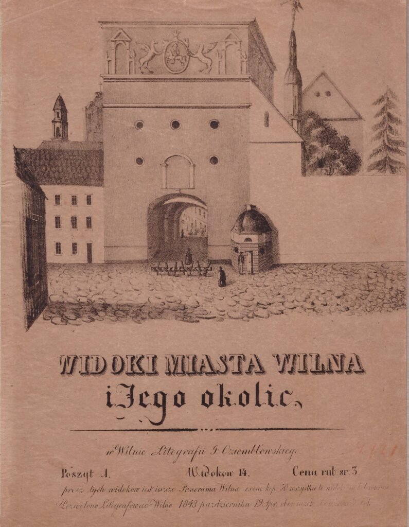 Vilniaus vaizdų serijos „Widoki miasta Wilna i Jego okolic“ viršelis su tekstu apie serijos apimtį, kainą, pardavimo sąlygas ir cenzūros leidimu spausdinti.