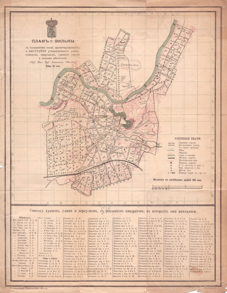 ПЛАНЪ Г. ВИЛЬНЫ Съ показанiемъ вновь прэктированныхъ и ВЫСОЧАЙШЕ утвержденныхъ улиц, номеровъ, кварталовъ, границъ города и рельефа мьестности.