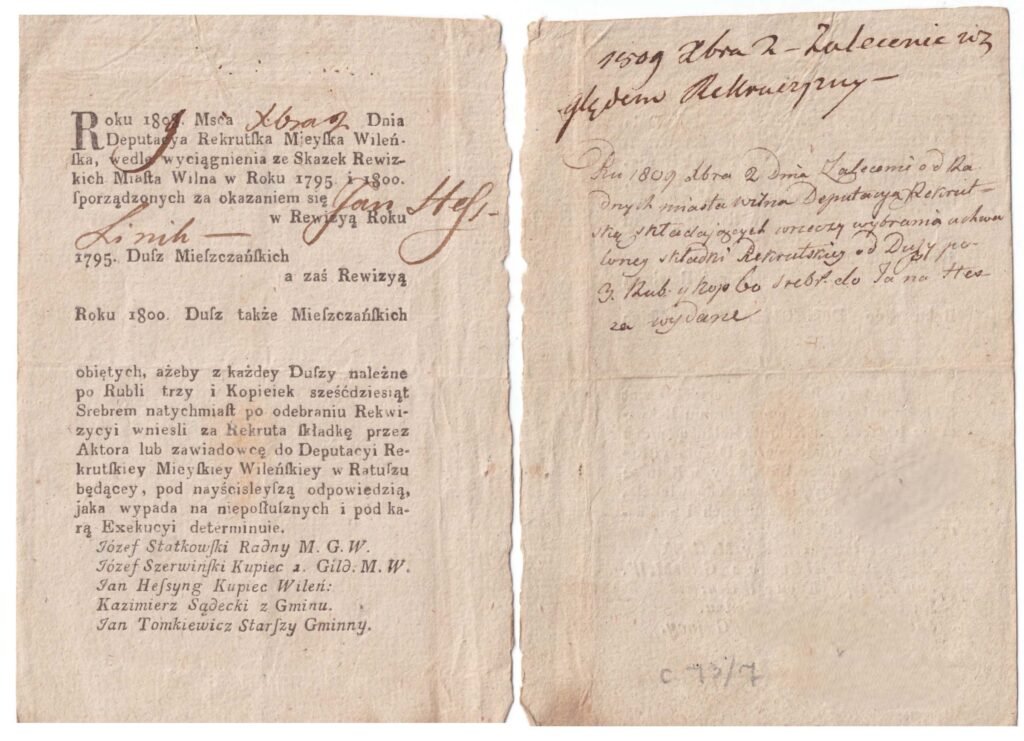 Kvitas, pagal kurį Vilniaus miestietis Jonas Hezas sumokėjo rekrutų rinkliavą 3 rublius 60 kapeikų už 1809 m. spalio mėnesį.