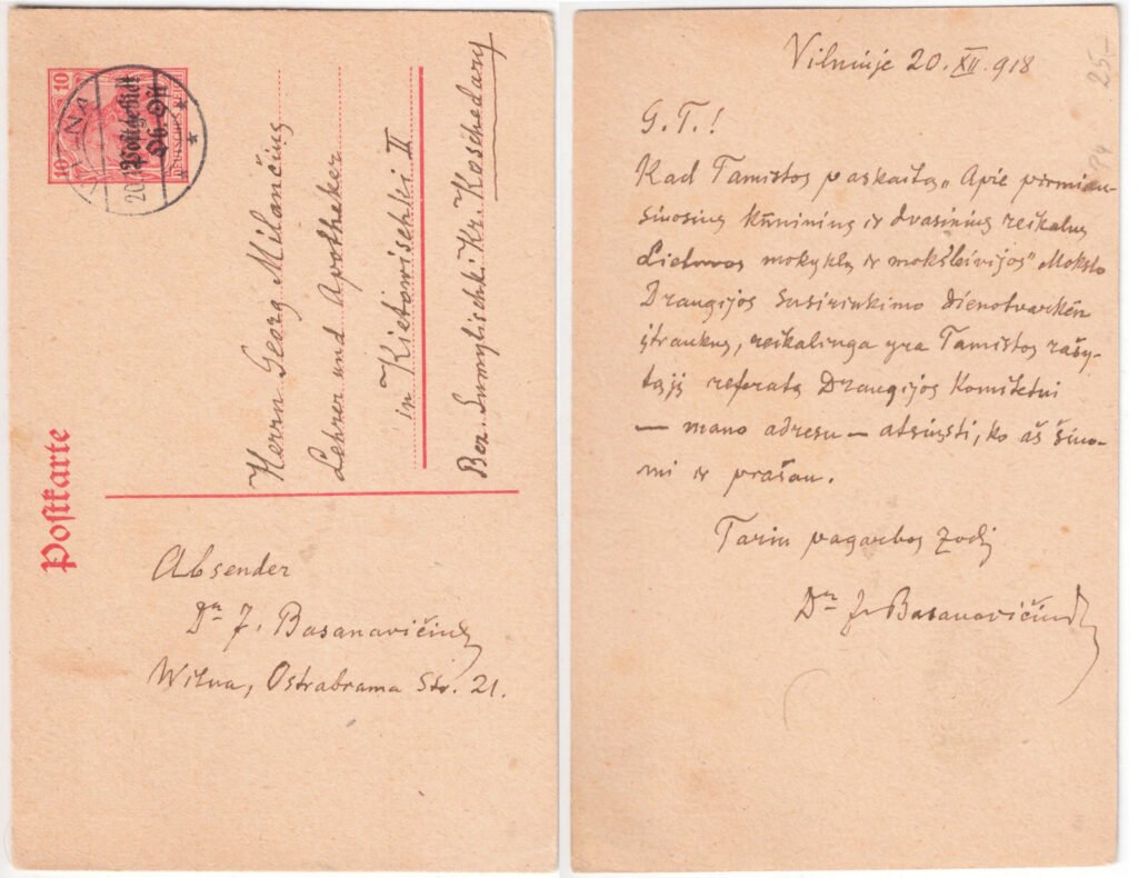 Laiškas Jurgiui Milančiui į Kietaviškes dėl paskaitos lietuvių mokslo draugijoje.