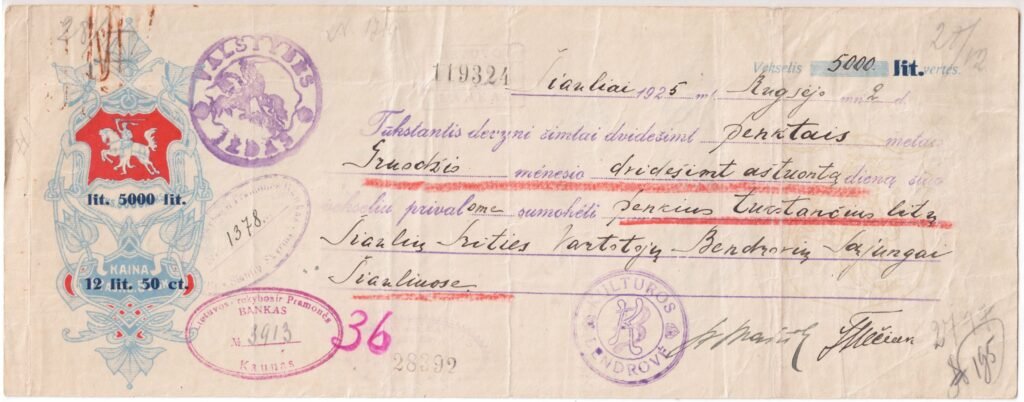 Kultūros“ bendrovės pasirašytas 5000 Lt perspausdintas (ant 5000 Auks.) vekselis.