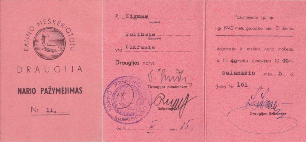 Kauno meškeriotojų draugijos nario pažymėjimas, išduotas advokatui Zigmui Toliušiui (1889–1971). Galiojo iki 1940 m.