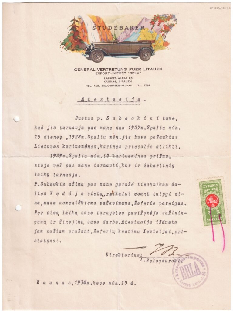 Automobilių „Studebaker“ atstovybės Lietuvoje atestacija-rekomendacinis laiškas, išduotas technikos dalies vedėjui p. Subockiui