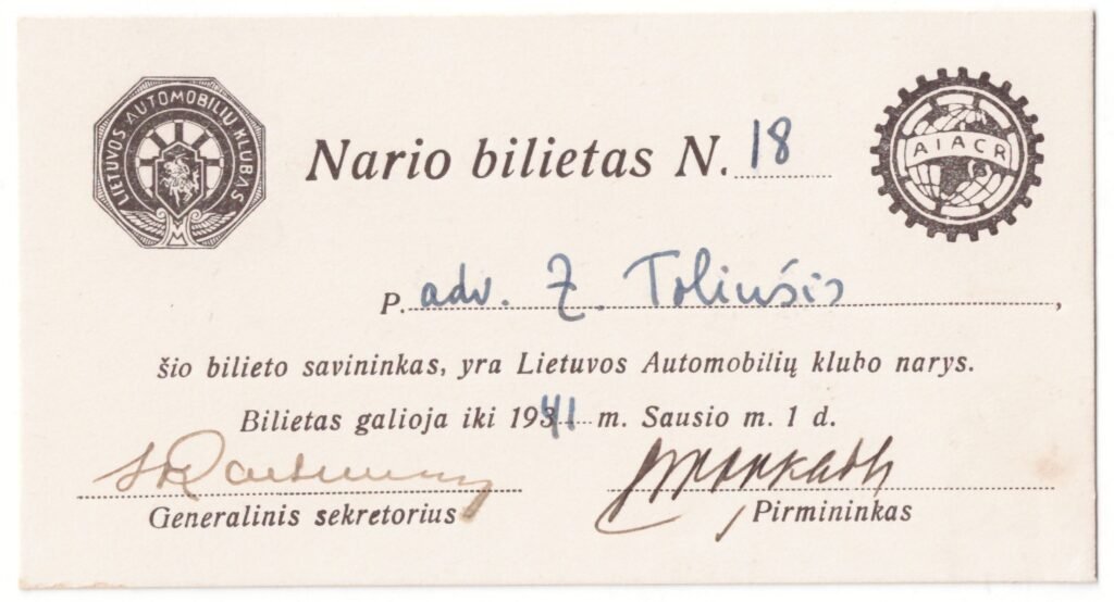Lietuvos automobilių klubo nario pažymėjimas, išduotas advokatui Zigmui Toliušiui (1889–1971). Galiojo iki 1941 m.