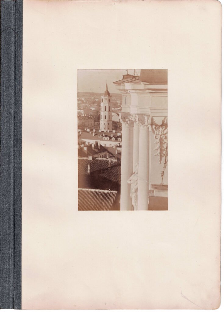 Dzwonnica i rog Katedry w dzien. Nuotrauka pažymėta autoriniame 1915 m. kataloge, t. I, skyrius „Katedra“, p. 6, Nr. 39. Fotografija, 16 × 9,5, paklijuota ant originalaus kartoninio albumo lapo 35 × 25 su drobelės pakraščiu įrišimui.