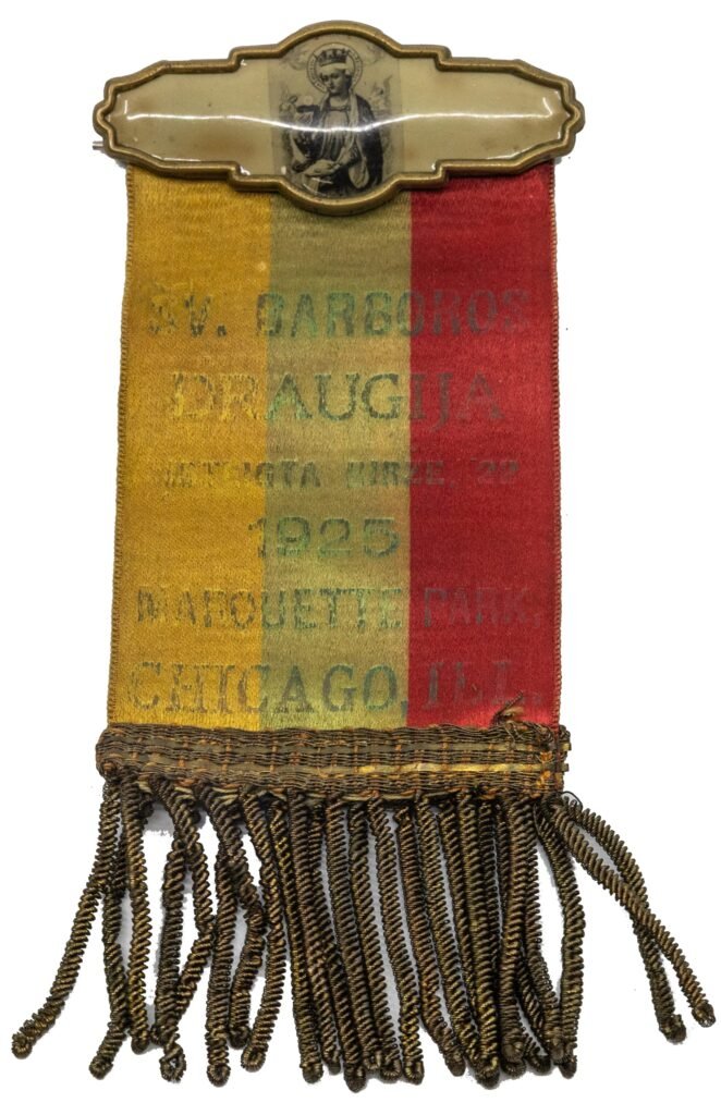 Bažnytinės brolijos ženklas-juostelė „Lietuvos Sunu ir Dukteru Draugija įsteigta 13 vasario 1921 m. Pittsfield, Mass.“. JAV. XX a. 3 deš.