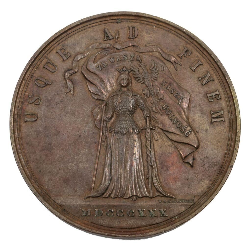 Aversas: priekyje stovi Polonia su grandininiais šarvais ir uniforma, laikanti kardą ir vėliavą, viršuje įrašas: „USQUE AD FINEM“, skiltyje data MDCCCXXX ir parašas W. A. MALINOWSKI, ant vėliavos užrašas: „ZA WASZĄ I NASZĄ WOLNOŚĆ“.