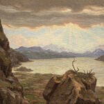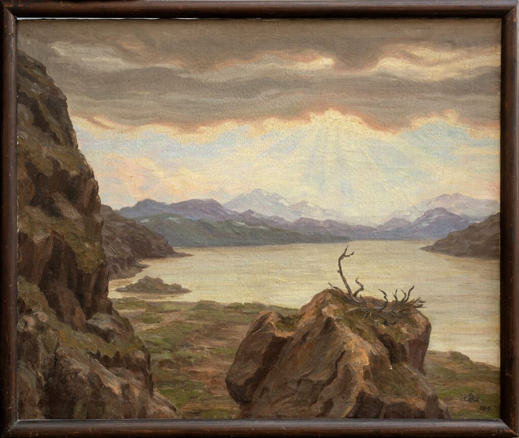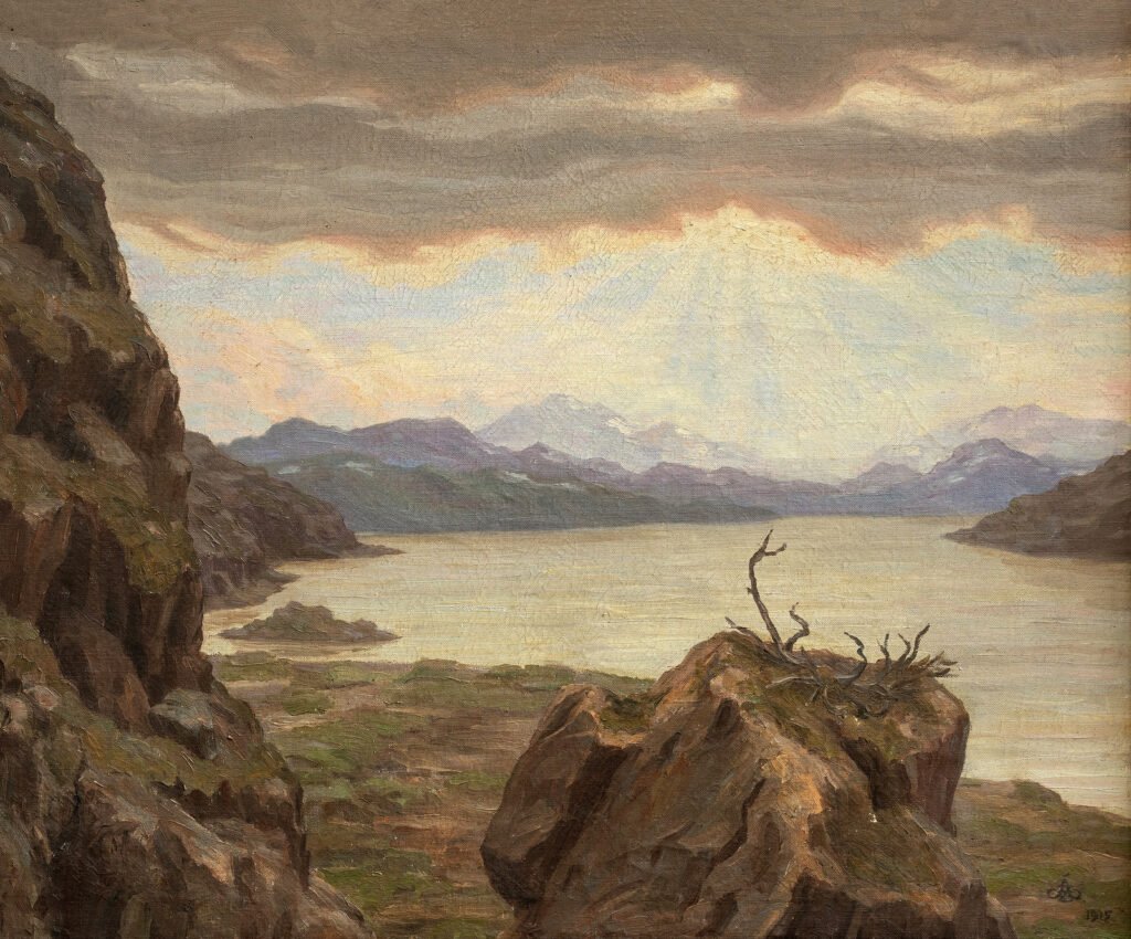 Reikėjo kitų priemonių – asketiškų, santūresnių, labiau išjaustų. Tad teko vaduotis iš ankstyvajai kūrybai būdingo etiudiškumo ir tapyti su epiniu užmoju, monumentalumu, įsijautus į šiaurietiškos gamtos didybę. Paveikslą sudarančias dvi dalis – uolų apsuptą niūrią vandens pakrantę ir gyvai nutapytą dangų – tolumoje atskiria melsva kalnų grandinė. Žema horizonto linija ir rusva uolų pilkuma leidžia sutelkti dėmesį į neramų dangų, kuriame vyksta tikro romantiko vertas reginys – gamtos gaivalų susidūrimas, kai šviesa nugali tamsą, išlaisvindama saulę iš debesų varžtų. Tapytojas mėgo susitapatinti su gamtine aplinka. Vienus jausmus jam kėlė lietuviškas, kitus – šiaurietiškas peizažas, nuteikdavęs filosofiniams apmąstymams. Norėdamas perteikti šiaurietišką tikrovę, autorius renkasi santūrias spalvas, pilkai rusvą koloritą, tačiau atsigauna, susidūręs su neramia debesų stichija, kuri prašyte prašosi ryškesnių spalvų, laisvų, ekspresyvių pastozinių potėpių, atkartojančių šviesos ir šešėlių kontrastą bei lengvai banguojantį gamtos motyvų ritmą, pakylėdamas neįmantrų vaizdą iki vidinės būsenos metaforos. Dėl šios priežasties peizažas slepia gilesnę potekstę, jis neatrodo niūrus, nes jame rusena vilties kibirkštėlė, kaip ir saulės spinduliai besiveržianti pro tirštą debesų sluoksnį.