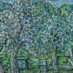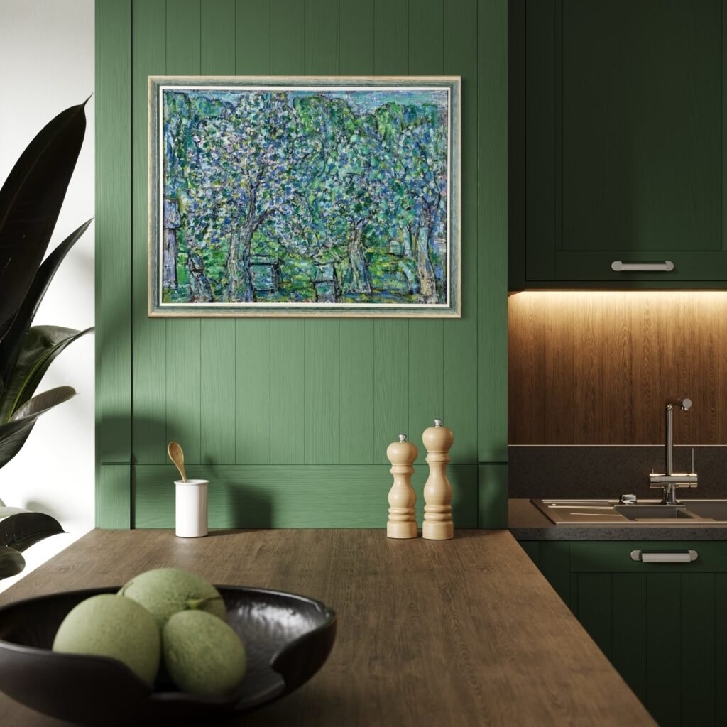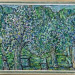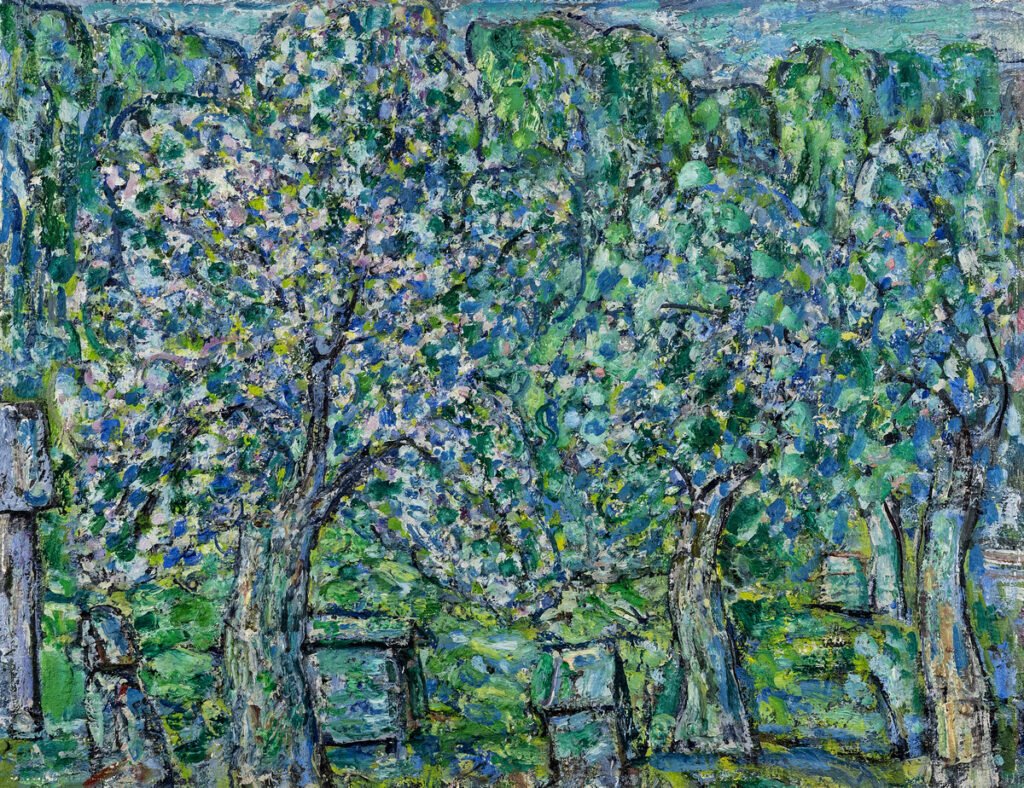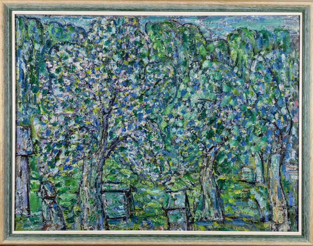 Tapybos darbe Peizažas su žydinčiu sodu ir aviliais, sukurtame vėlyvuoju kūrybos periodu, menininkas užfiksavo karštą, pilną žiedų ir bičių dūzgimo pavasario dieną. Vaizdavimui pasirinko artimą žiūros tašką, tačiau medžių kamienai ir aviliai, tarsi nutolę, susiliejantys į mirgantį vientisą, pilną žalių, melsvų ir baltų atspalvių audinį, o vienintelė žmogaus figūra virtusi neatsiejama peizažo dalimi.